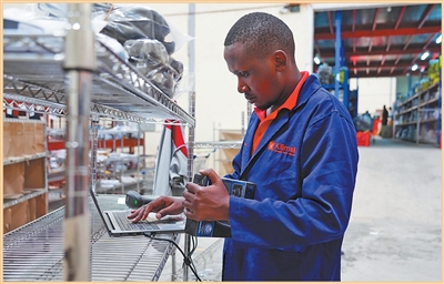 肯尼亚首都内罗毕近郊的电商企业Kilimall仓库内,当地工作人员在复核订单。
