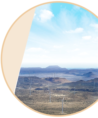 在南非北开普省德阿镇拍摄的德阿风电项目风机。该项目由中国国家能源集团龙源电力南非公司建成投运,总装机容量24.45万千瓦。