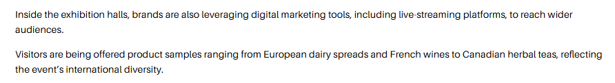 文章注意到,本届消博会有来自60多个国家和地区的超过3400个品牌参展,参展国际展品占比65%,较去年提升20个百分点。在展馆内,各品牌还借助直播平台等数字营销工具来触达更广泛的受众群体。参观者可以品尝到从欧洲乳制品、法国葡萄酒到加拿大草本茶等各种产品样品,这充分体现了展会的国际多样性。