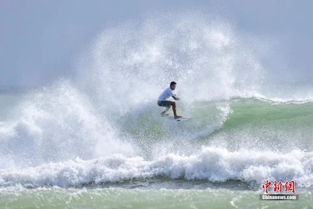 三亚市后海吸引众多游客前来体验冲浪。骆云飞 摄(资料图)
