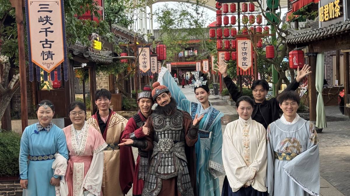 “从小喜欢练武术,没想到这门手艺能让我在长江边吃上饭。”赵长延笑着说,他一人饰演多个角色——蜀汉士兵、穿越快闪、彩色狂欢等,每个都能拿捏到位。