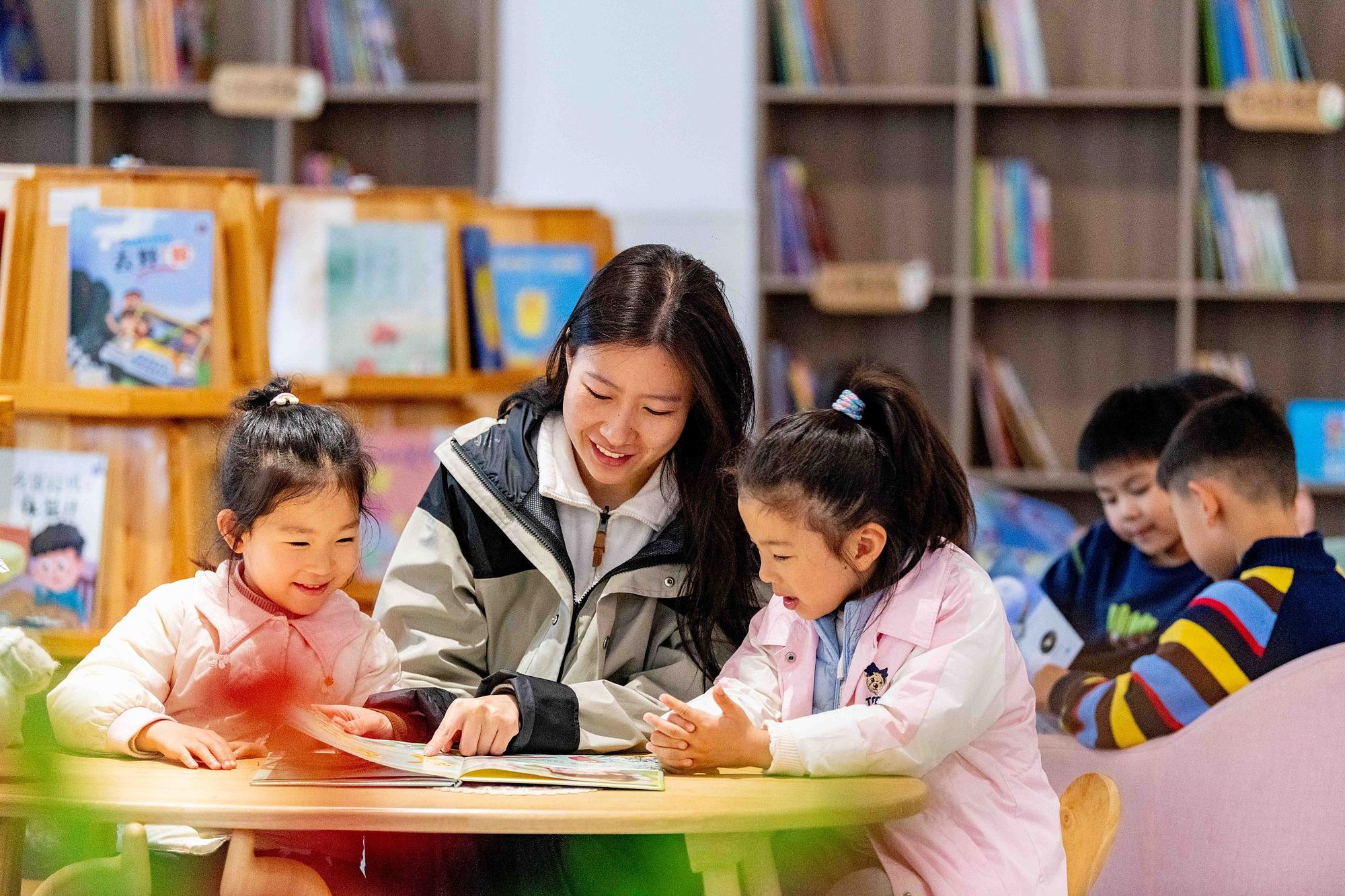 2026年4月22日,江苏泰州,老师和小朋友们在幼儿园阅览室阅读绘本故事。