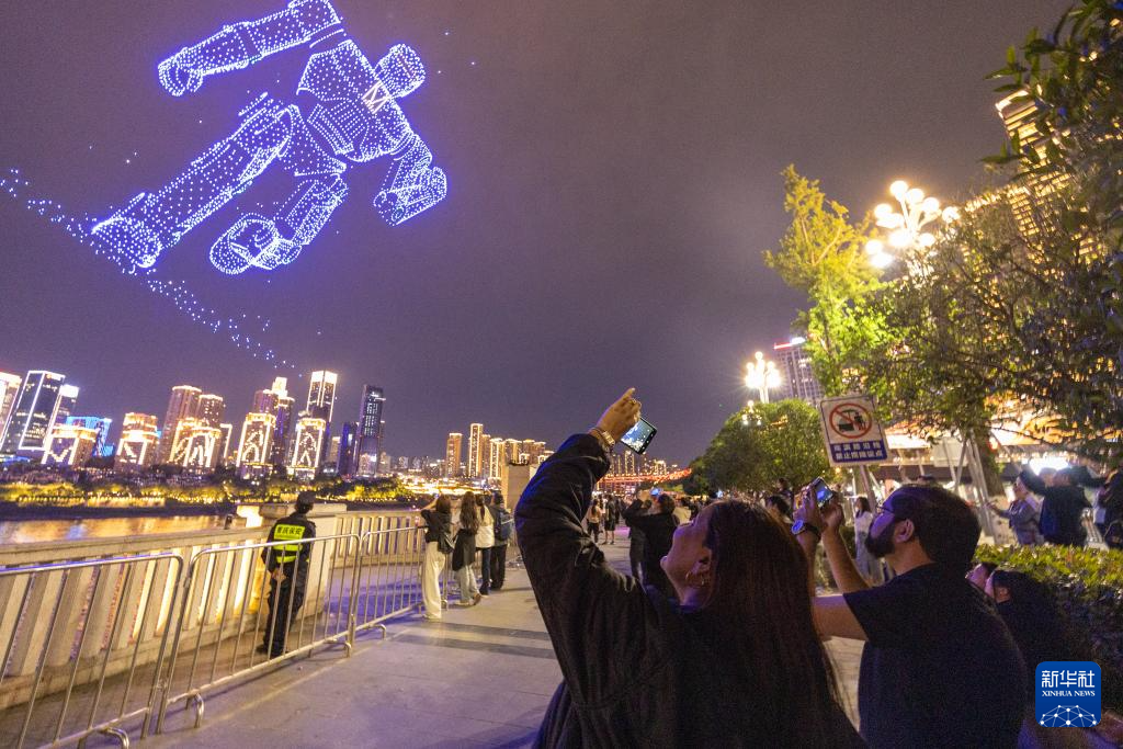 ↑ 4月22日,外籍游客在重庆市南岸区南滨路拍摄无人机灯光秀表演。