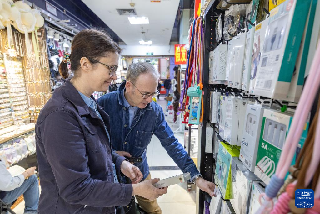 ↑ 4月22日,在重庆市渝中区新重庆国际小商品批发中心,来自法国的一对夫妇在选购充电宝。