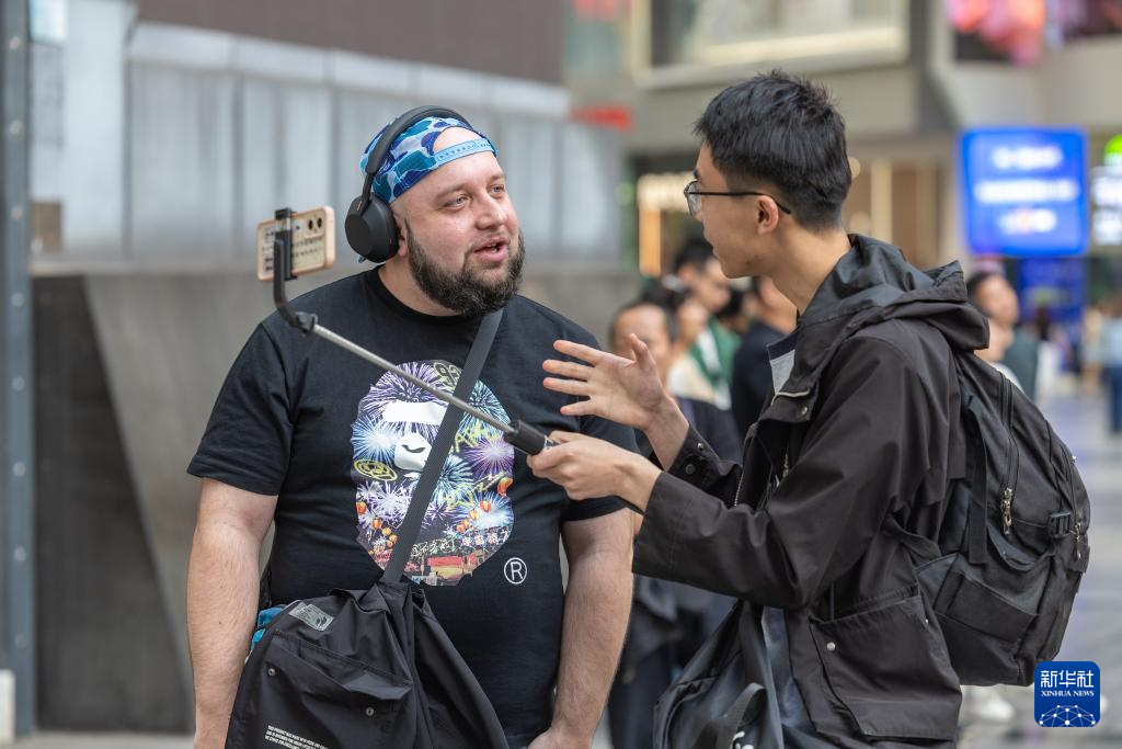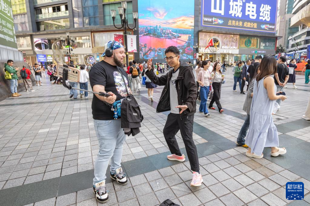 ↑ 4月22日,在重庆市渝中区解放碑商圈,一名荷兰游客(左)和一名中国博主交流。