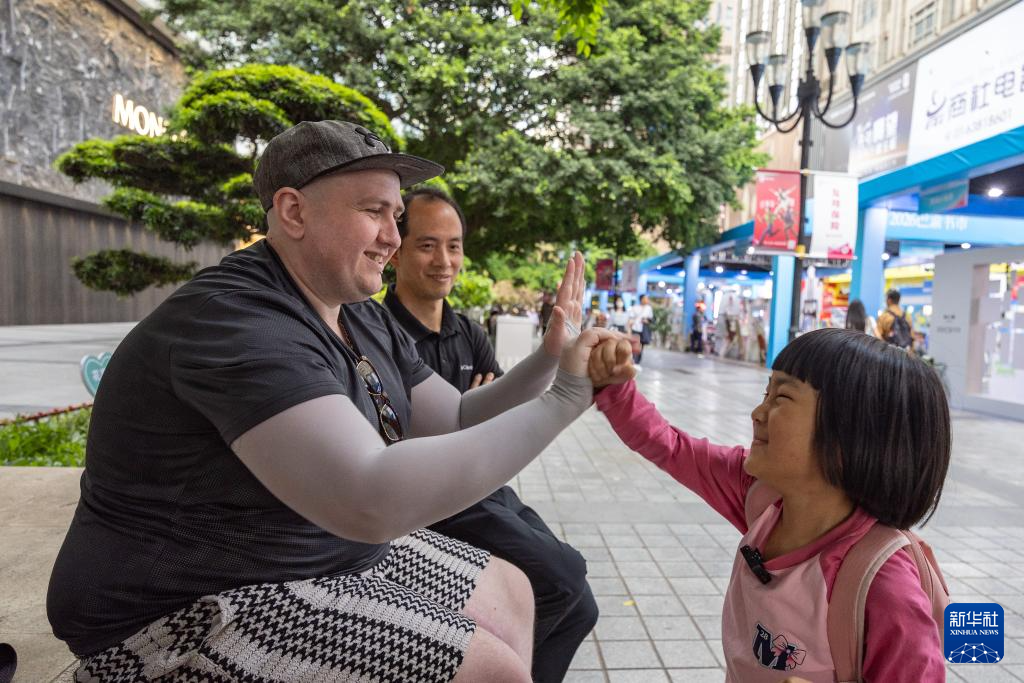 ↑ 4月22日,在重庆市渝中区解放碑商圈,一名中国小女孩和来自爱尔兰的游客互动。