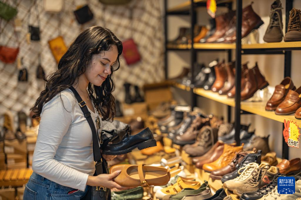↑ 4月22日,在重庆市渝中区新重庆国际小商品批发中心,来自墨西哥的游客在选购女鞋。