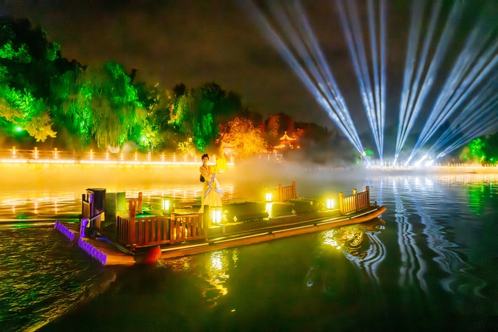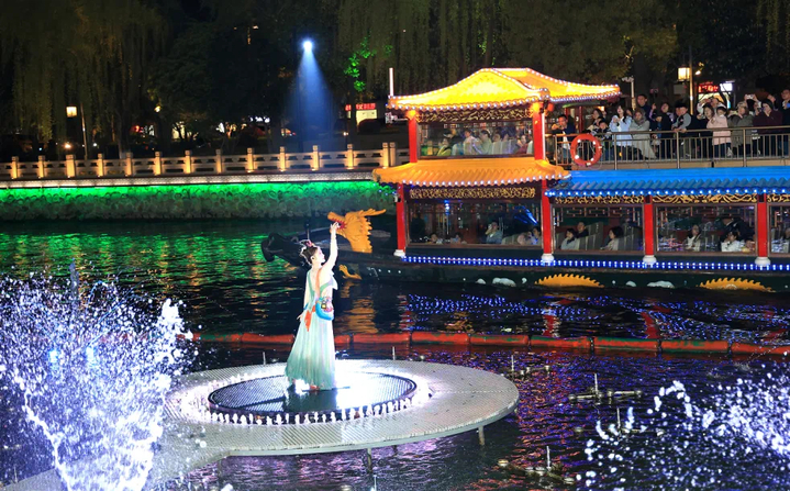 同一种“活化”文脉的手笔,在扬州古运河上演着别样的精彩。在全国首创的“行进式游船+岸线光影科技+实景演艺”模式中,《大运扬州》将2500年的运河史浓缩在60分钟的航程里。船行水上,两岸全息水幕骤亮,李白仗剑吟诗、吴王夫差开凿邗沟的恢弘景象扑面而来。这里的历史不再是冰冷的展品,而是可以与之对望、共情的精神纽带。