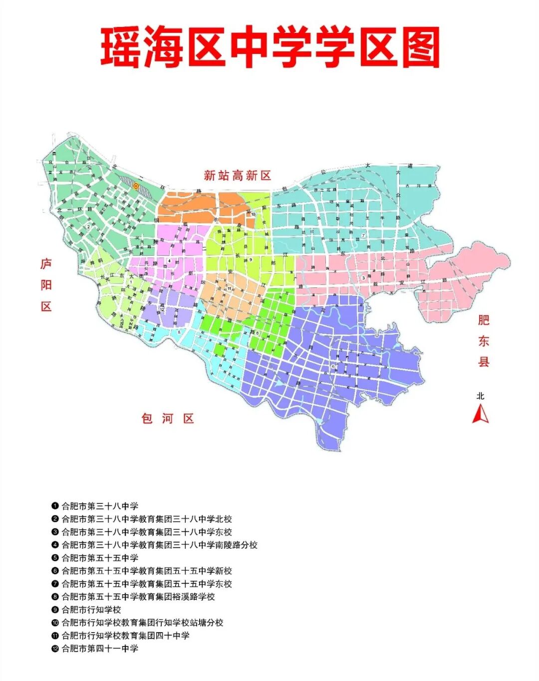 卧龙湖路以西、泗水路(铁路线)以北、板桥河(与庐阳区交界线)以东、东方大道以南区域(含原新店社居委、高峰社居委、三元社居委、北岗社居委、横店社居委、杜大郢社居委)。