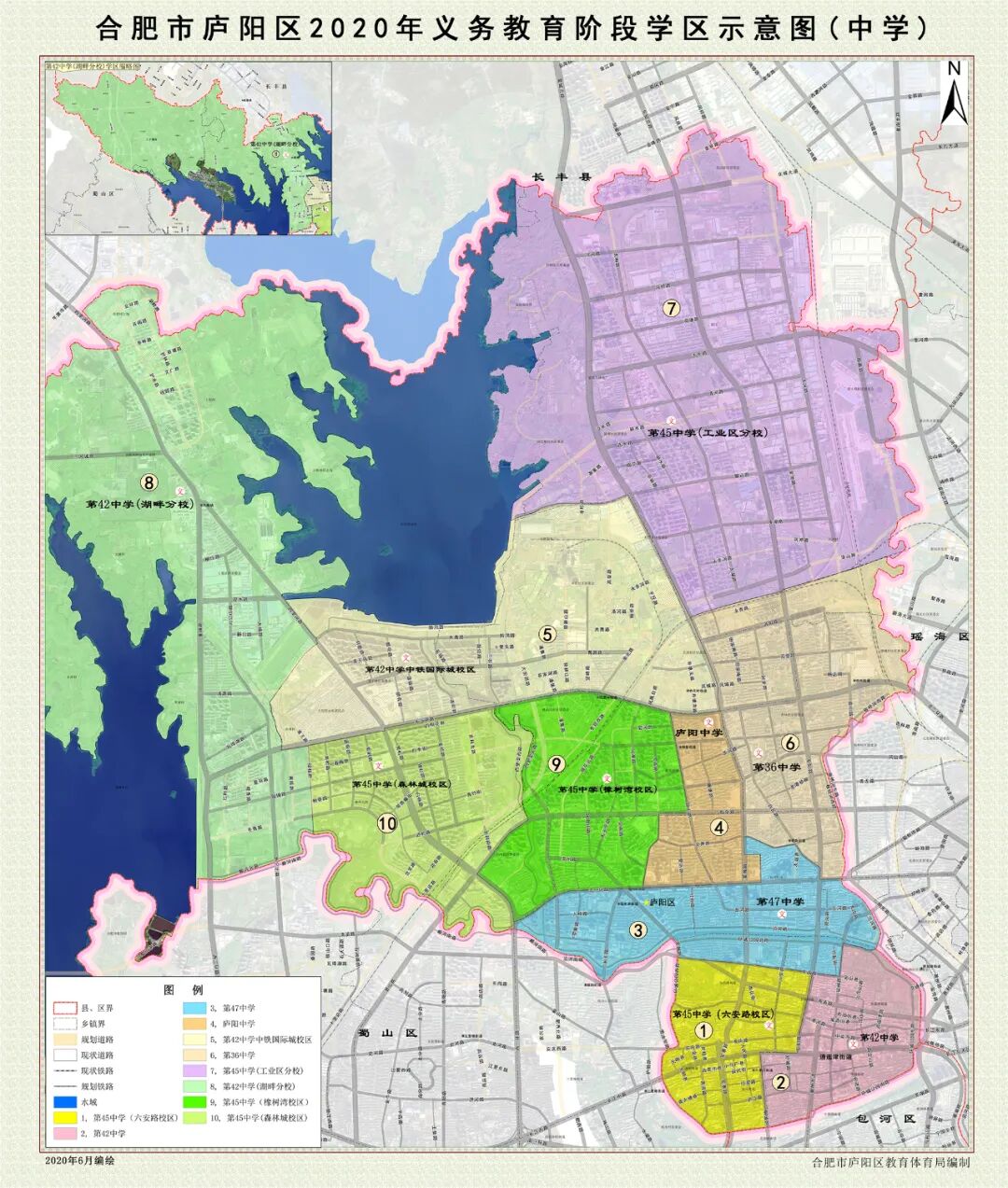 卧龙湖路以西、东方大道以北、板桥河(与庐阳区交界线)以东、梅冲湖路以南新站区域(含罗巷社居委、瓦岗社居委)。