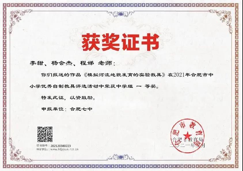 在刚刚结束的“2021年全省中小学优秀自制教具展评活动”中,由合肥七中李甜、杨会杰、程娣老师制作的《模拟河流地貌发育》的实验教具代表合肥市参加全省优秀自制教具比赛,斩获安徽省一等奖。