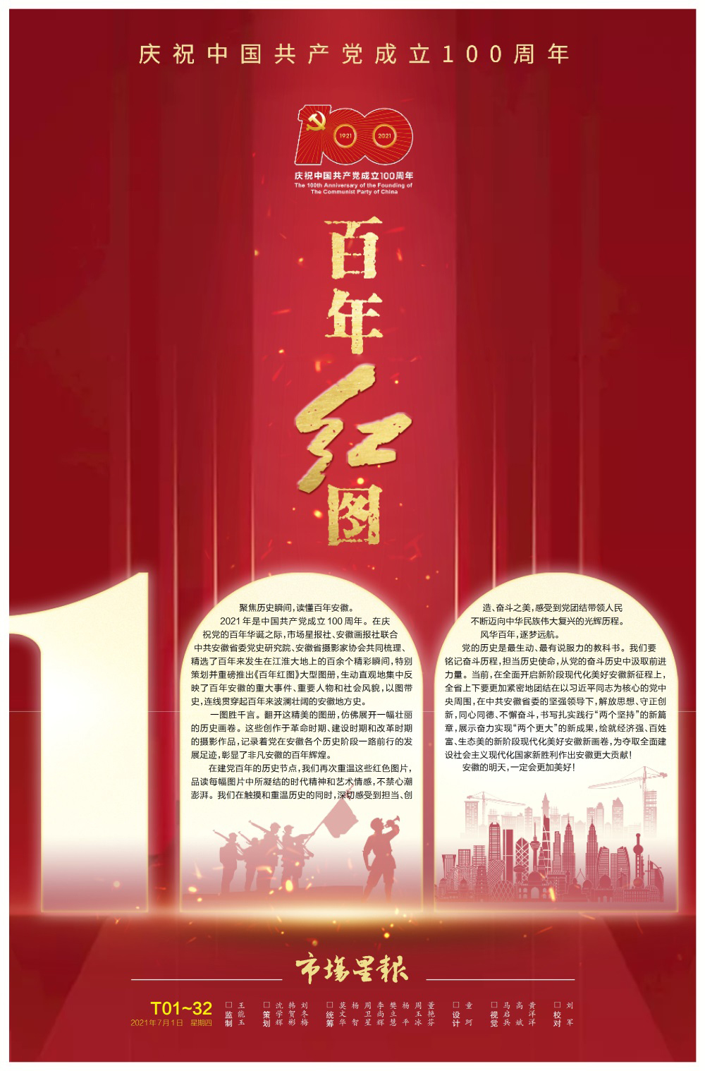 2021年是中国共产党成立100周年。在庆祝党的百年华诞之际,市场星报社、安徽画报社联合中共安徽省委党史研究院、安徽省摄影家协会共同梳理、精选了百年来发生在江淮大地上的百余个精彩瞬间,特别策划并重磅推出《百年红图》大型图册,生动直观地集中反映了百年安徽的重大事件、重要人物和社会风貌,以图带史,连线贯穿起百年来波澜壮阔的安徽地方史。