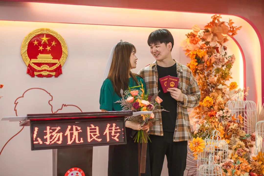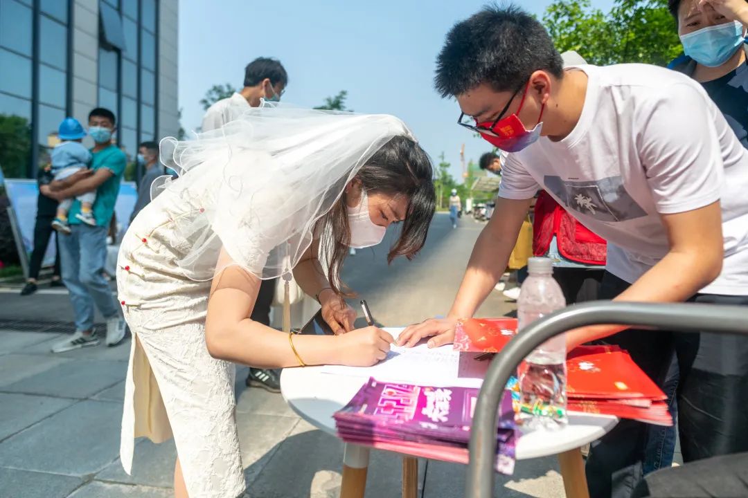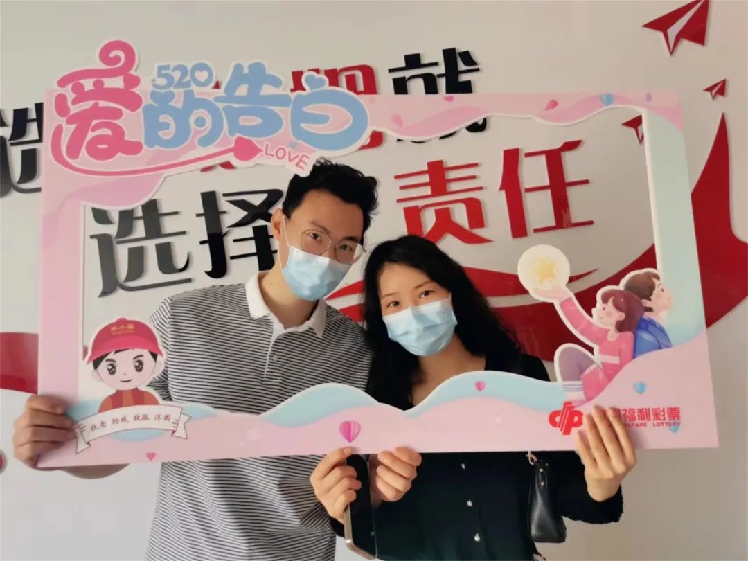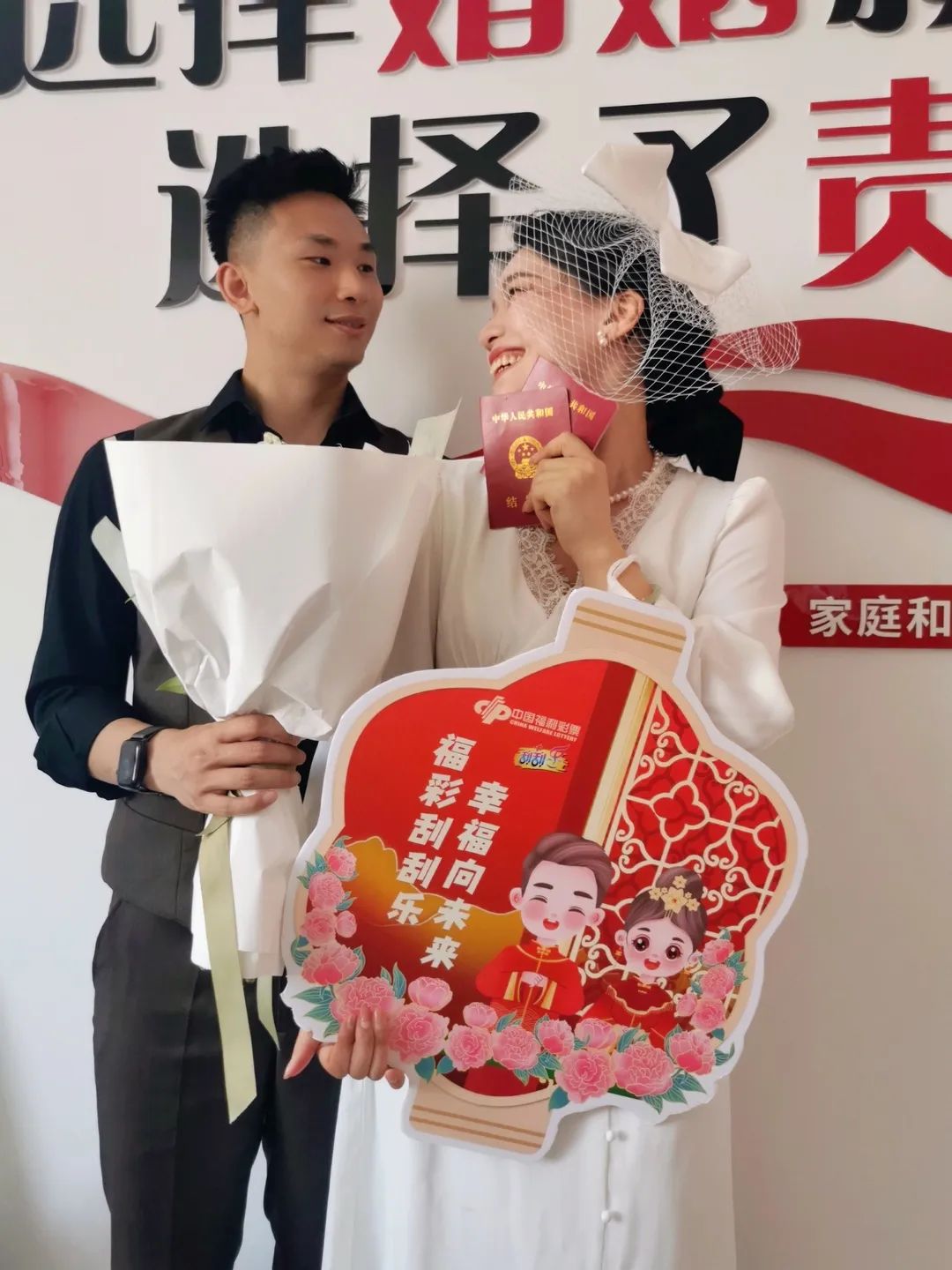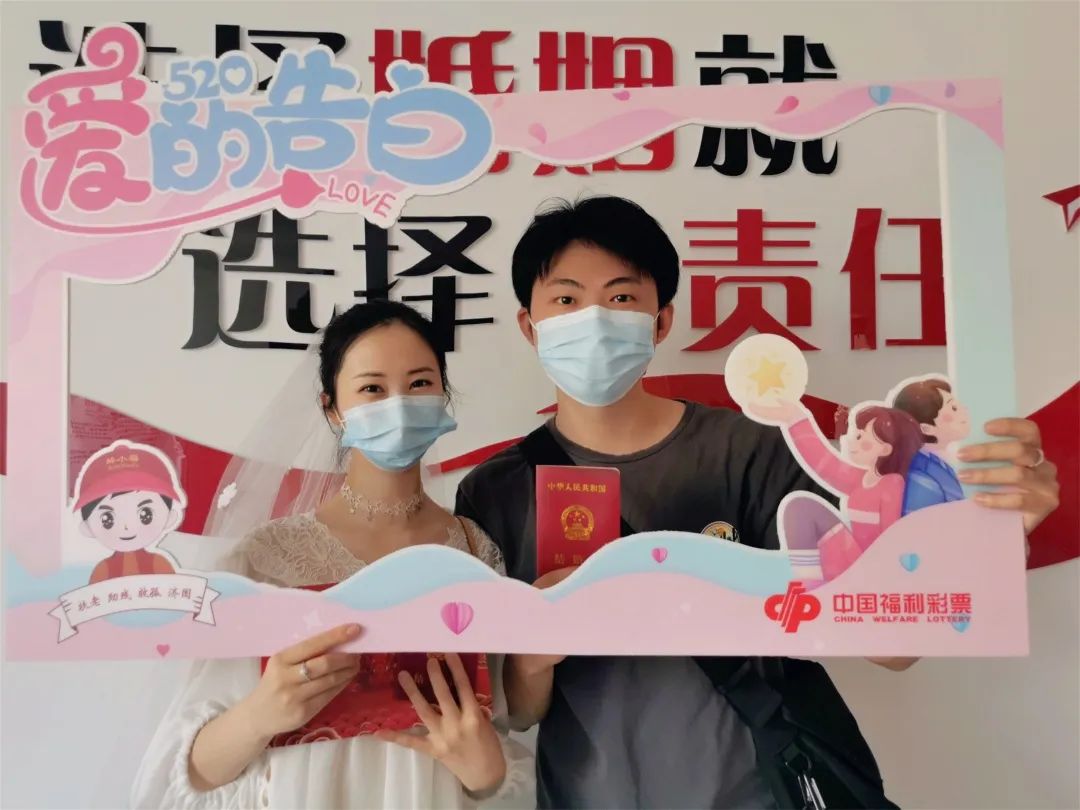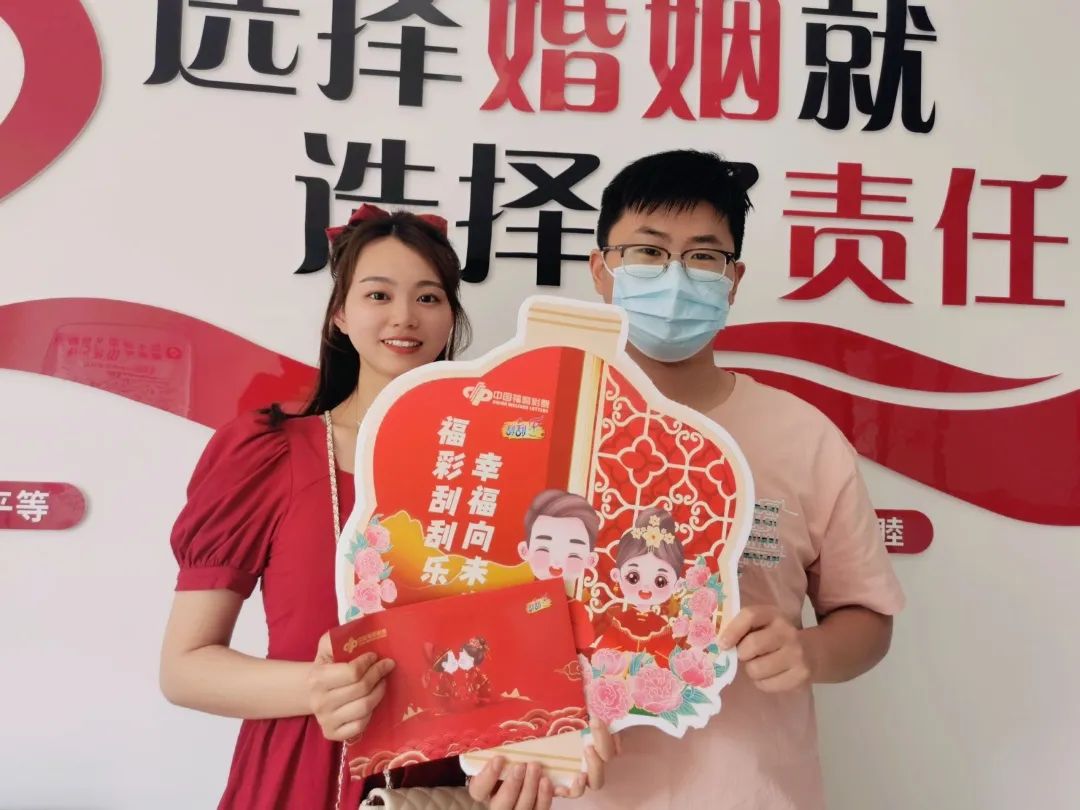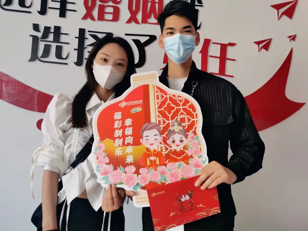520,为爱出“彩”!当天,由安徽省福彩中心举办的2022年第三届即开票婚庆类主题票推广活动之“送福添喜,你结婚我送礼”活动,在蚌埠市、滁州市部分婚礼登记现场举行,数百对新婚夫妇凭结婚证免费领取了福彩即开票婚庆票“大礼包”!