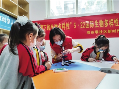 7 合肥市包河区同安街道周谷堆社区新时代文明实践站联合凤巢园幼儿园联合举办了“显微镜下的生物多样性”的主题活动。 ■许雯雯 沈娟娟