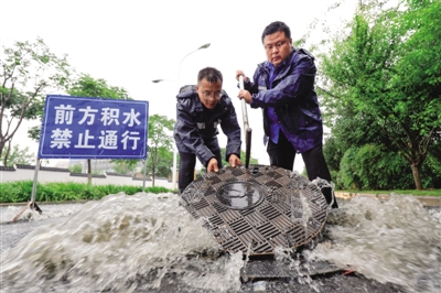 3 6月28日早晨,合肥庐阳经济开发区城市管理部组织人员冒雨赶到各积水路段,撬开井盖快速排水,并在周边设置安全警示牌,他们在雨中坚守岗位。 ■ 赵 明
