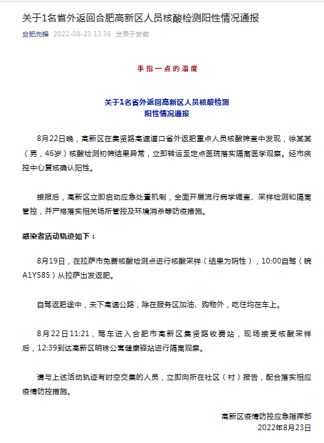 据合肥先锋微信号消息,2022年8月23日,高新区疫情防控应急指挥部发布关于1名省外返回高新区人员核酸检测阳性情况通报: