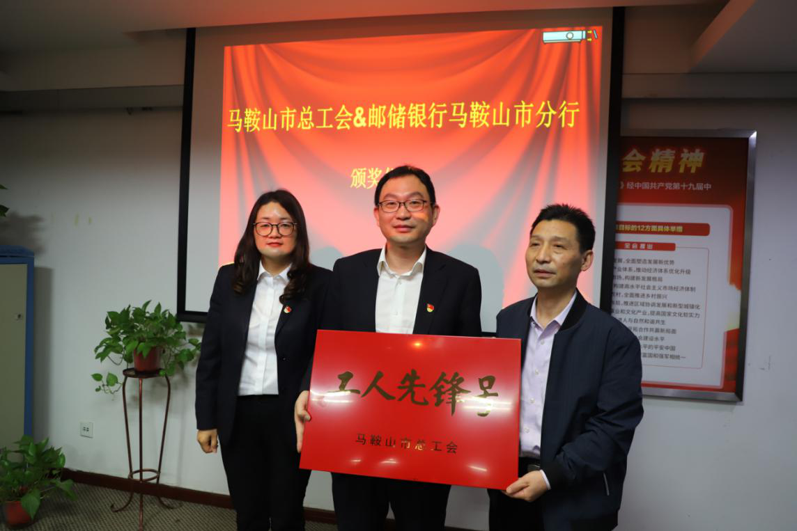 近日,邮储银行马鞍山市当涂县支行被马鞍山市总工会授予“工人先锋号”荣誉称号。4月29日上午,马鞍山市总工会党组成员、经审会主任欧阳海福一行深入邮储银行马鞍山市分行走访调研,并为邮储银行当涂县支行送来荣誉奖牌。