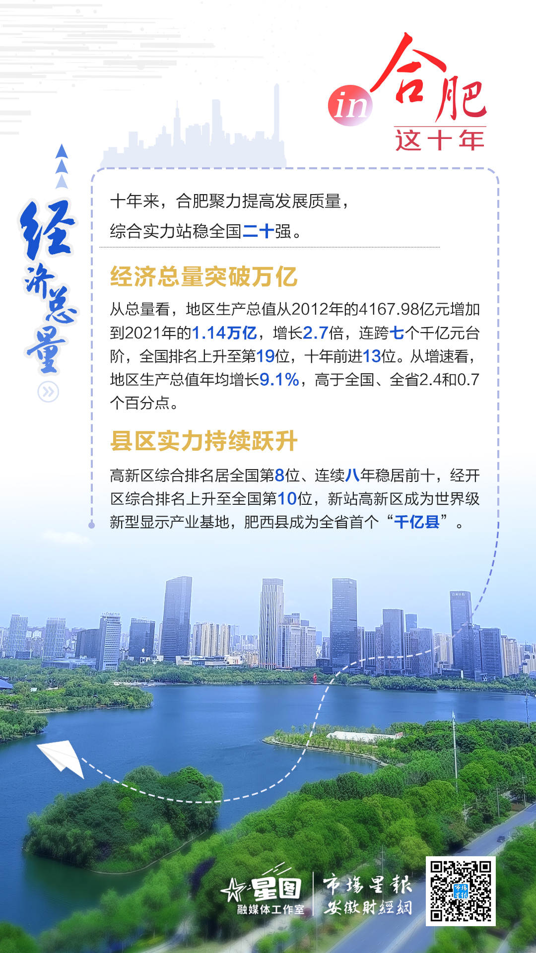 2012年,合肥地区生产总值为4167.98亿元,经过十年的高质量发展,这个数据在2021年增加到了1.14万亿,突破万亿的同时也增长2.7倍,连跨七个千亿元台阶。而随着地区生产总值突破万亿,合肥在全国排名也上升至第19位,十年前进了13位。 7月19日,“合肥这十年”新闻发布会召开,市场星报、安徽财经网策划推出《星图说丨in合肥 这十年》,一起来看合肥这十年!
