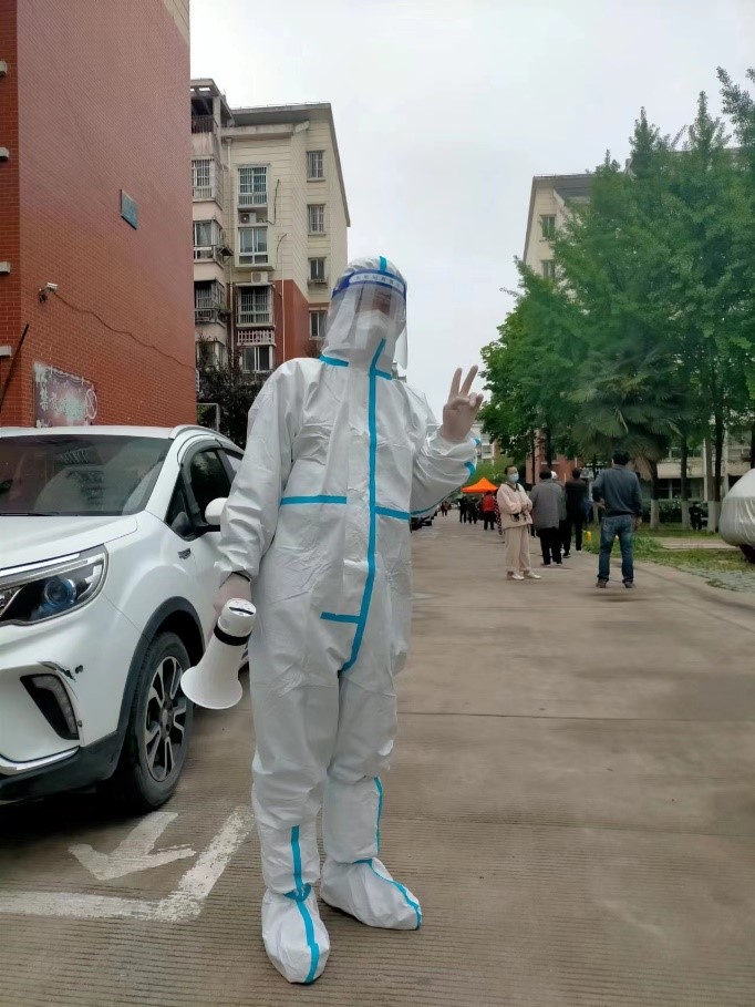 每次居民核酸检测时,郑雨穿上防护服,化身“大白”,成为居民排队秩序的“引导员”。郑雨说:“做好秩序引导就是一个字:喊!”为了维护采集顺序,保证不扎堆,郑雨拿着喇叭一栋楼一栋楼地喊;为了保持安全距离,避免交叉感染风险,郑雨在排队居民旁边一遍遍地喊。有人担心他嗓子受不了,郑雨淡淡一笑说:“我以前在部队时天天喊,早就练出来了。”