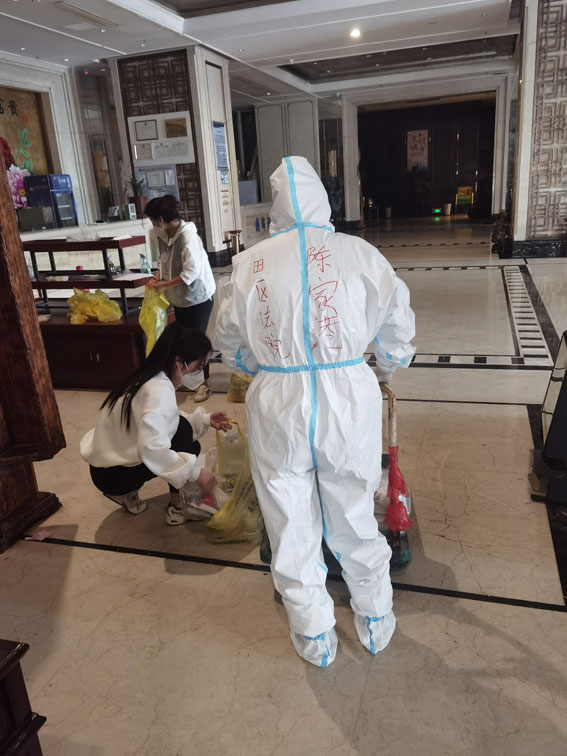 在隔离酒店,我每天的工作主要有接收隔离人员,登记人员信息,纾解人员困难等。有时一天会来几批隔离人员,我和同事常常工作至凌晨,实在累了就在地上铺上纸板一躺,休息片刻再继续投入工作。