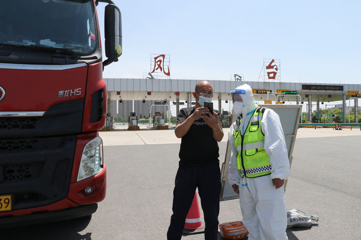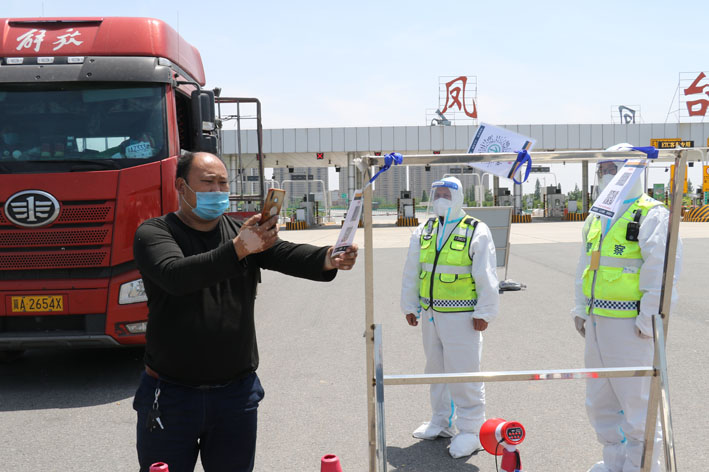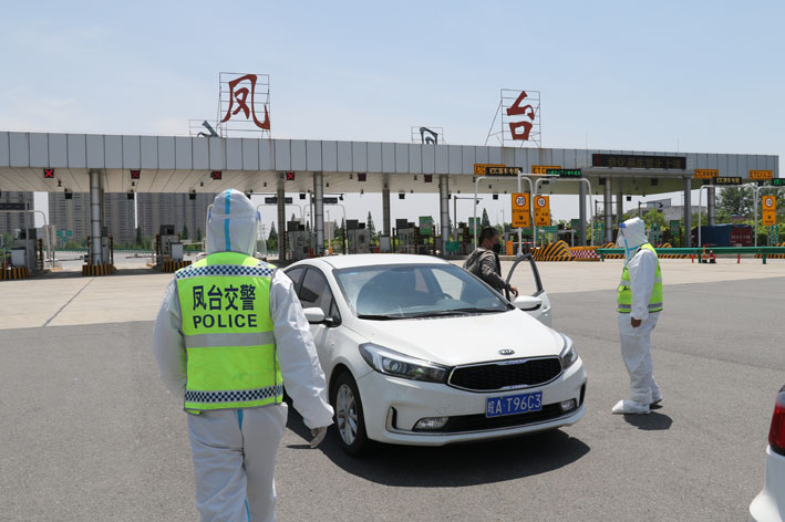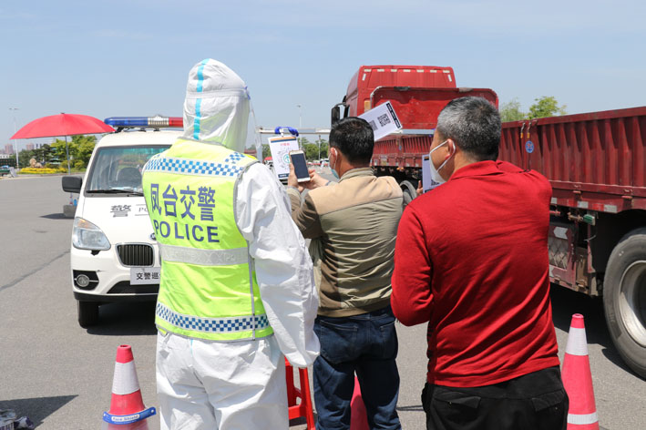 图为“五一”期间,在德上高速凤台出口交通检疫检测点,凤台交警严格落实“落地查”“落地检”和“落地管”,筑牢外防输入关,严守高速路口“前哨站”。