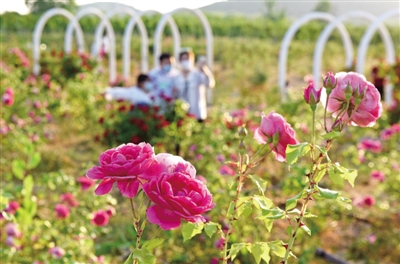 5月6日, 淮南市民在生态环境修复后的九大采煤塌陷区综合治理项目月季园中赏花游玩。全国重要能源基地淮南市抓好“九龙岗——大通”采煤塌陷区综合治理,项目区占地面积9.3平方公里, 总投资8.15亿元人民币,治理涵盖生态环境修复、水环境治理、基础设施建设等内容,该项目生态修复后绿化覆盖率由不足20%提升至75%以上。陈彬 赵永莉/图