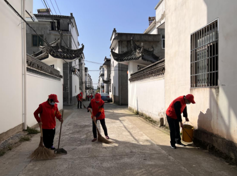 4月8日,在黄山市徽州区潜口村街头巷尾“不老松”服务队正沿街开展文明创建、宣传疫情防控知识等,用实际行动助力乡村治理。