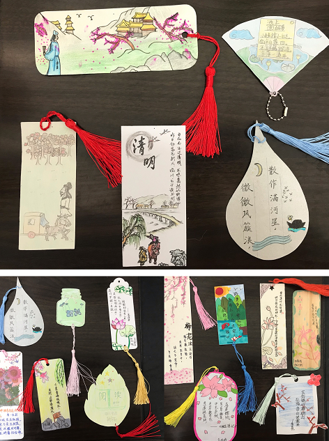 一首首经典的古诗文被孩子们以图文并茂的方式呈现在方寸之间。在内容上,有描绘四季风光的书签,有催人奋进的励志书签,也有表达传统节日的书签;在造型上,有普通的长方形书签,有形象逼真的葫芦书签,有憨鞠可爱的动物书签……