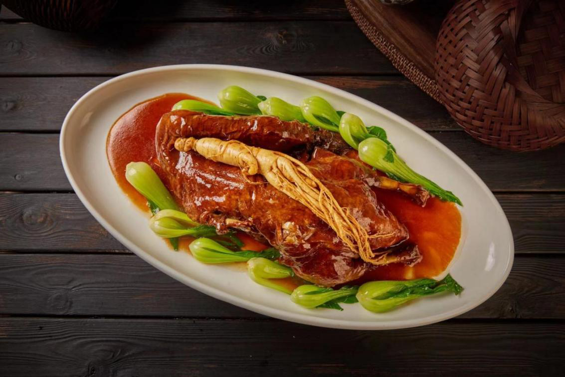 取当地红嘴番鸭,佐以十六味中药,大火焖烧,小火收汁。出锅后,只见焖鸭表皮光泽明亮,鲜香可口,其肉细嫩,酥而不烂,老少咸宜。不仅养肺滋阴,也除热止咳,真是养生又解馋。