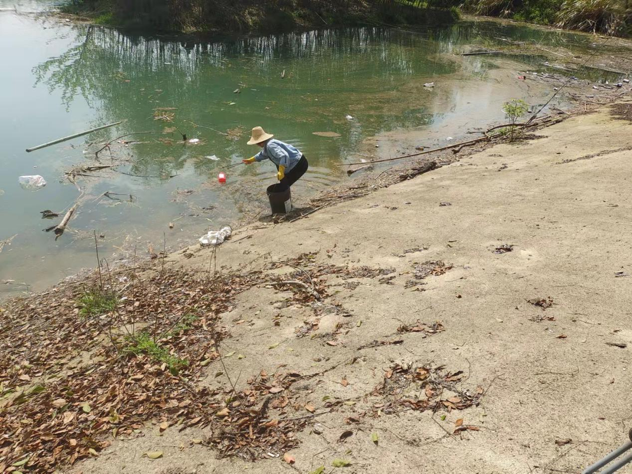 巡河员沿着河边巡查河道环境,对河边垃圾进行清理,与此同时,积极展开宣传,告知过往行人,垃圾要扔进垃圾桶,不要再给河流制造垃圾污染。