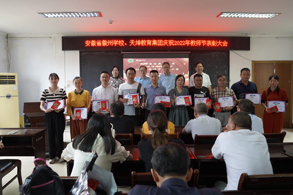天坤教育集团总裁孙义致辞。何萍副校长宣读2022年度宣城市师德先进个人和2022年度绩溪县师德先进个人名单。天坤教育集团学校管理中心总监胡金朝宣读荣获天坤教育集团的先进集体和先进个人名单,安徽省徽州学校和天坤教育集团领导为获奖者颁发奖牌、奖杯和荣誉证书,全场报以热烈的掌声。获奖教师代表洪晓春发表获奖感言:感谢大家对我的工作的认可,能够获奖很荣幸,很激动,今后要以习近平总书记提出的“四有”好老师的标准严格要求自己,全身心投入到教育教学中去,争取更好的成绩。