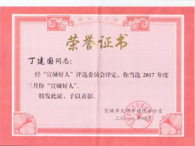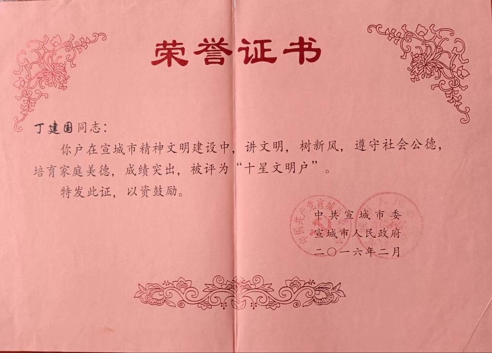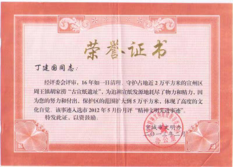 由于丁老的辛勤付出,他曾被评为“宣城好人”,先后受到周王镇党委政府颁发的“优秀村民组长奖”,“新农村建设先进个人奖”和“第二届最美周王人道德模范奖”以及宣州区委区政府颁发的“精神文明建设先进个人奖”和“道德模范提名奖”······那些奖项内容都是统一的,只有“宣城市精神文明建设指导委员会”2013年2月专授他的颁奖辞是:“丁建国同志,经评委会评审,16年如一日清理,守护占地近2万平方米的宣州区周王镇胡家涝‘古宣纸遗址’,为追溯宣纸发源地耗尽了物力和精力,因为您的努力和付出,保护区的范围扩大到5万平方米,体现了高度的文化自觉。该事迹入选市2012年5月份月评‘精神文明先进事迹’。特发此证,以资鼓励”。
