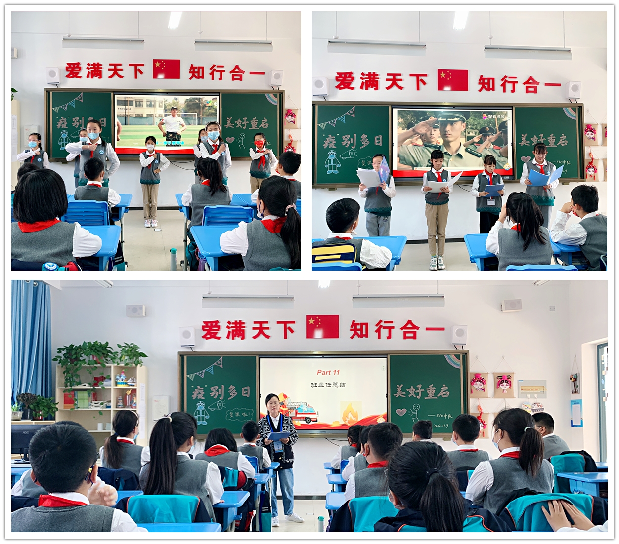 此次主题班会以生动直观的方式展开,同学们通过收集讲解火灾案例,普及消防安全常识和逃生技巧,观看视频“走进消防员的一天”等形式了解消防;以手抄报、歌曲、舞蹈、朗诵以及三句半表演等方式来礼赞消防员,将消防安全的理念深深地扎根于同学们的心中。