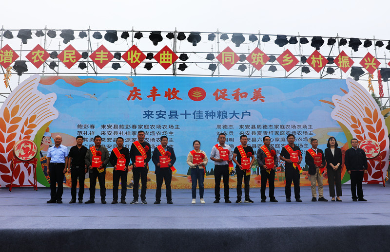 “热闹,喜庆,让人感受到浓浓的丰收的喜悦。”坐在台下的雷官镇农民代表侯松伟不由自主地跟着鼓点节奏打着节拍,侯松伟原本在上海担任一家全国连锁企业的片长,2015年,因父亲突发脑溢血,他决定回到家乡,接手父亲经营的家庭农场。回来后,他抓住一切机会学习粮食种植知识和技能,购买植保无人机等农业机械用于生产,创办农机合作社,开展农机社会化服务,还利用网络售卖农产品,2022年,农场利润达到120万元,今年,他还被评为“来安县十佳种粮大户”,在此次丰收节活动现场接受了表彰。“现在的政策、环境都这么好,在农村大有可为。”侯松伟说。