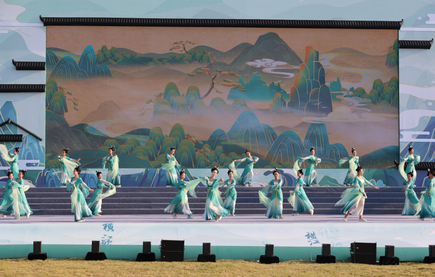 江风徐徐,秋阳朗照。在开幕式现场,观席座无虚席。舞台主背景呈现融合传统元素的卷轴、马头墙造型,令人耳目一新。两侧矗立着诗仙李白诗文《望天门山》《夜泊牛渚怀古》和“人民保护长江、长江造福人民”的醒目标语,主打“只此青绿”的淡雅色调与诗城的山水浑然一体。
