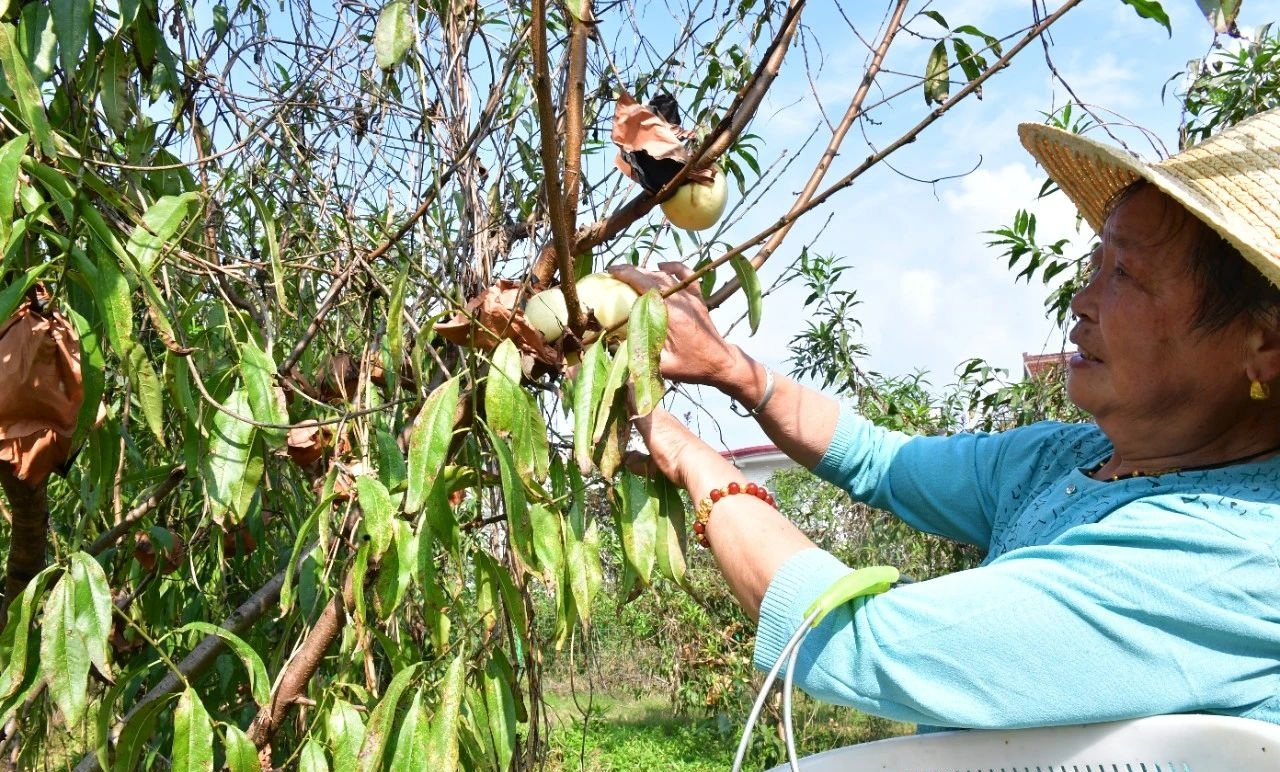 汪桥村村民陈光秀正在桃园里帮忙采摘冬桃,她说,自己常年在村精品果蔬采摘休闲园打零工,农闲时帮村采摘园干些除草、剪枝、施肥等临工,每天能有100元的收入,每年能增收1万多元。