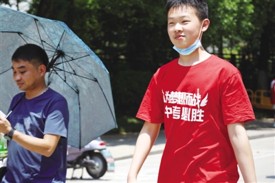 ④一名参加中考的考生穿着印有“为梦想而战 中考必胜”字样的T恤。记者 张良弓