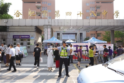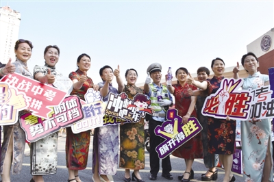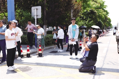 ②6月14日,合肥交警经开大队在各考点周边加强交通秩序管控疏导,执勤民警还在考点外与送考家长合影,为考生加油鼓劲。合交宣 记者 沈娟娟 唐朝