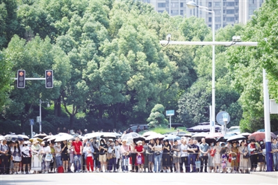 ③48中望湖校区考场外一名家长为考生拍照留念。 记者 周诚