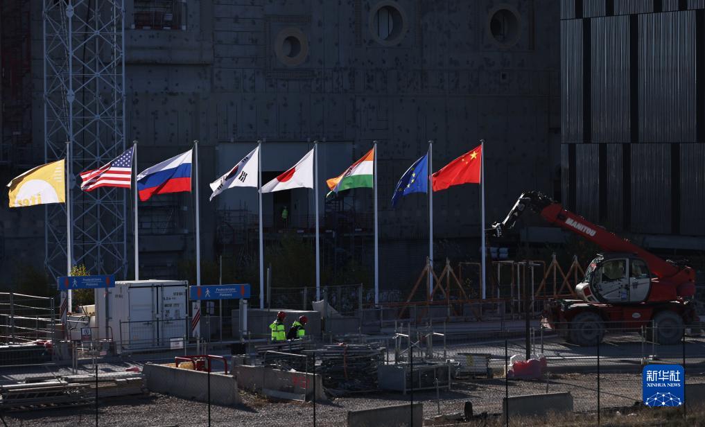 11月24日,在位于法国圣保罗-莱迪朗斯的国际热核聚变实验反应堆(ITER)的建造厂房外,中国、欧盟、印度、日本、韩国、俄罗斯、美国七个参与方的旗帜和ITER组织的旗帜迎风飘扬。新华社记者 高静 摄