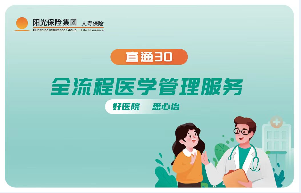 “直通30”服务是阳光人寿于2022年推出的,以满足客户对于优质医疗服务与保障需求的服务体系。依托“直通30”服务,阳光人寿可以为不幸罹患特定高发癌症(10种)的患者提供国内知名三甲医院优质的诊疗服务体验,让患者在主诊医生和专属病案经理的全程协助下,享受从初诊、复诊、住院及院外康复全流程医学管理服务。一旦符合理赔条件,客户还能获得保险理赔,减轻患者康复治疗的经济压力。