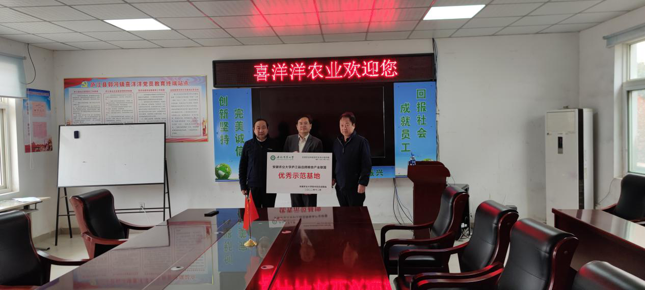 2022年12月30日,安徽农业大学新农村发展研究院下发通知,公布安徽农业大学县城农业产业联盟2022年优秀示范基地评选结果,位于庐江县郭河镇的安徽喜洋洋农业科技有限公司榜上有名。3月26日,新农院副院长黄正来一行赴该公司举行授牌仪式,这是安徽喜洋洋农业在实施“藏粮于地、藏粮于技”战略,推进“两强一增”行动在基层落地生根又一重要成果。