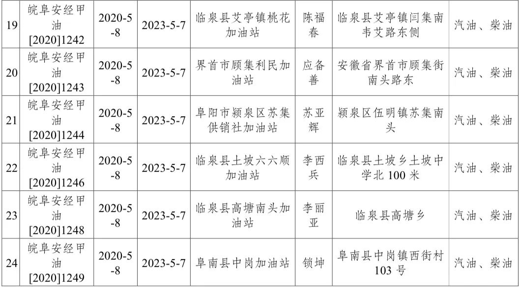 市场星报、安徽财经网(www.ahcaijing.com)、掌中安徽讯 ( 记者 杨文艺)近日,阜阳市应急管理局发布通报,依法注销临泉县梁塘加油站等24家企业《危险化学品经营许可证》。