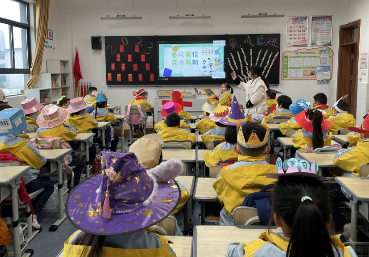 据了解,开学前夕,学校要求学生们利用各式环保材料,自己动手制作一顶有创意的帽子,每顶帽子代表着新学期的梦想和目标。开学当天,戴着创意“梦想帽”走进校园,预示着孩子们将要为了新学期的梦想而努力。