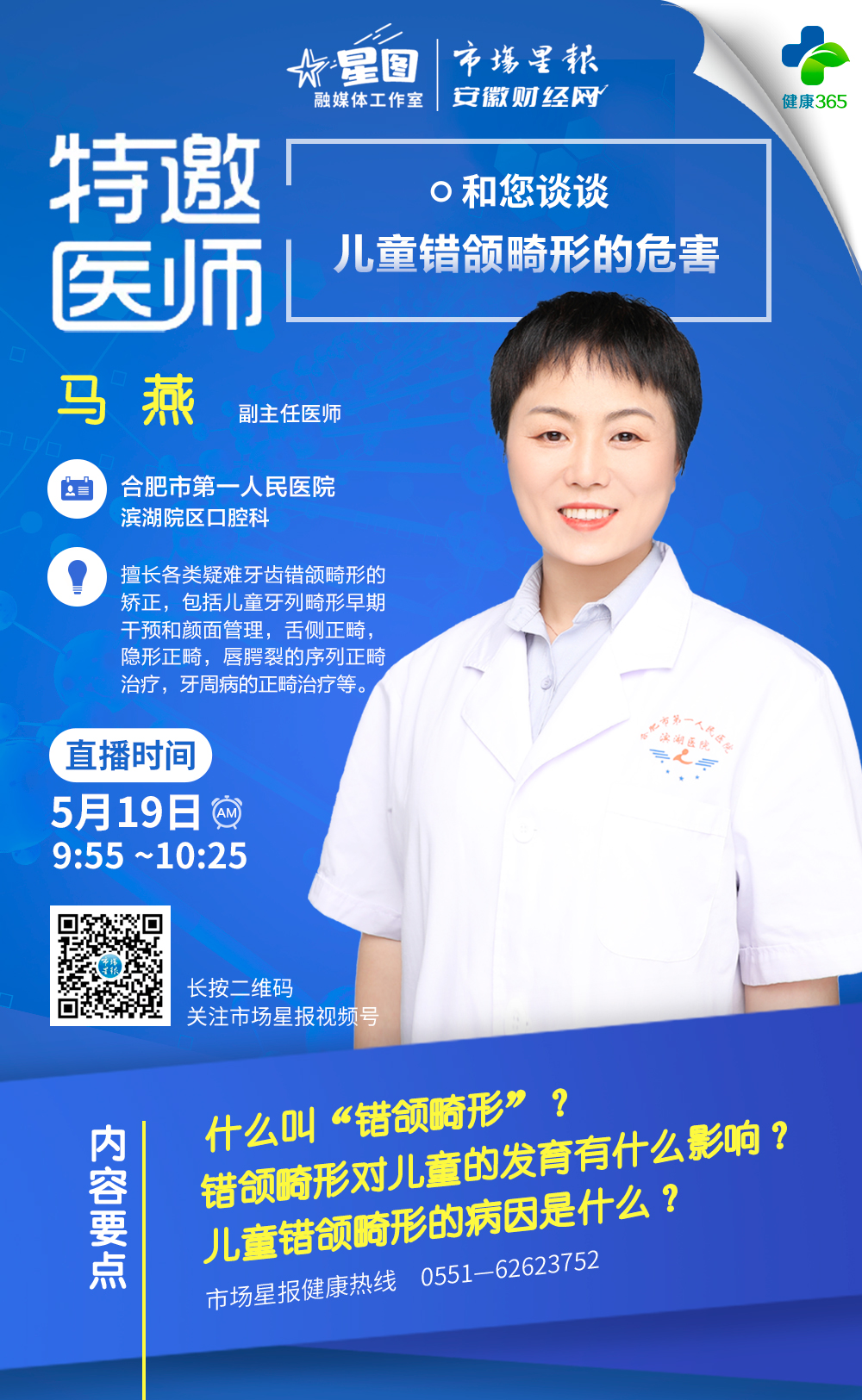 那么,什么叫做“错颌畸形”?错颌畸形对儿童的发育有何影响?儿童错颌畸形的病因有哪些?5月19日上午09:55—10:25,本报健康热线0551-62623752,邀请了合肥市第一人民医院滨湖院区口腔科副主任医师马燕与读者交流,和您谈谈“儿童错颌畸形的危害”,欢迎读者朋友拨打电话咨询,更多内容,请关注市场星报视频号“健康365”栏目直播。