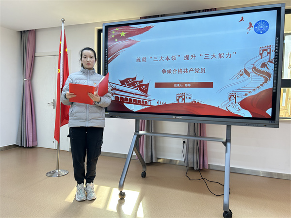 组织委员陈烨同志以“练就‘三大本领’提升‘三大能力’,争做合格党员”为题,给党员老师们上了一堂生动的微党课。陈烨同志从以学铸魂练就“看家本领”,不断提升政治能力;以学增智练就“兴党本领”,不断提升思维能力;以学促干练就“强国本领”,不断提升实践能力;主动作为,争做合格党员等四个方面,结合实际深入讲解,阐述了如何练就“三大本领”,提升“三大能力”。