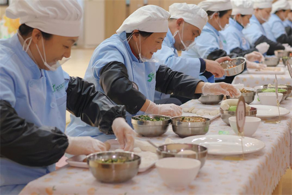 比赛中,大家热情高涨,每个人都忙得不亦乐乎。放肉馅、捏饺皮、摆造型,纷纷亮出自己的绝活。饺子皮在她们的手中飞转,大厨们个个大显身手,花边饺、元宝饺、月牙饺,包出来的饺子各式各样。整整齐齐摆列的饺子精致可爱,样式新奇,俨然成了整齐的“饺子方阵”,承载着厨房工作人员对膳食的匠品与匠心。