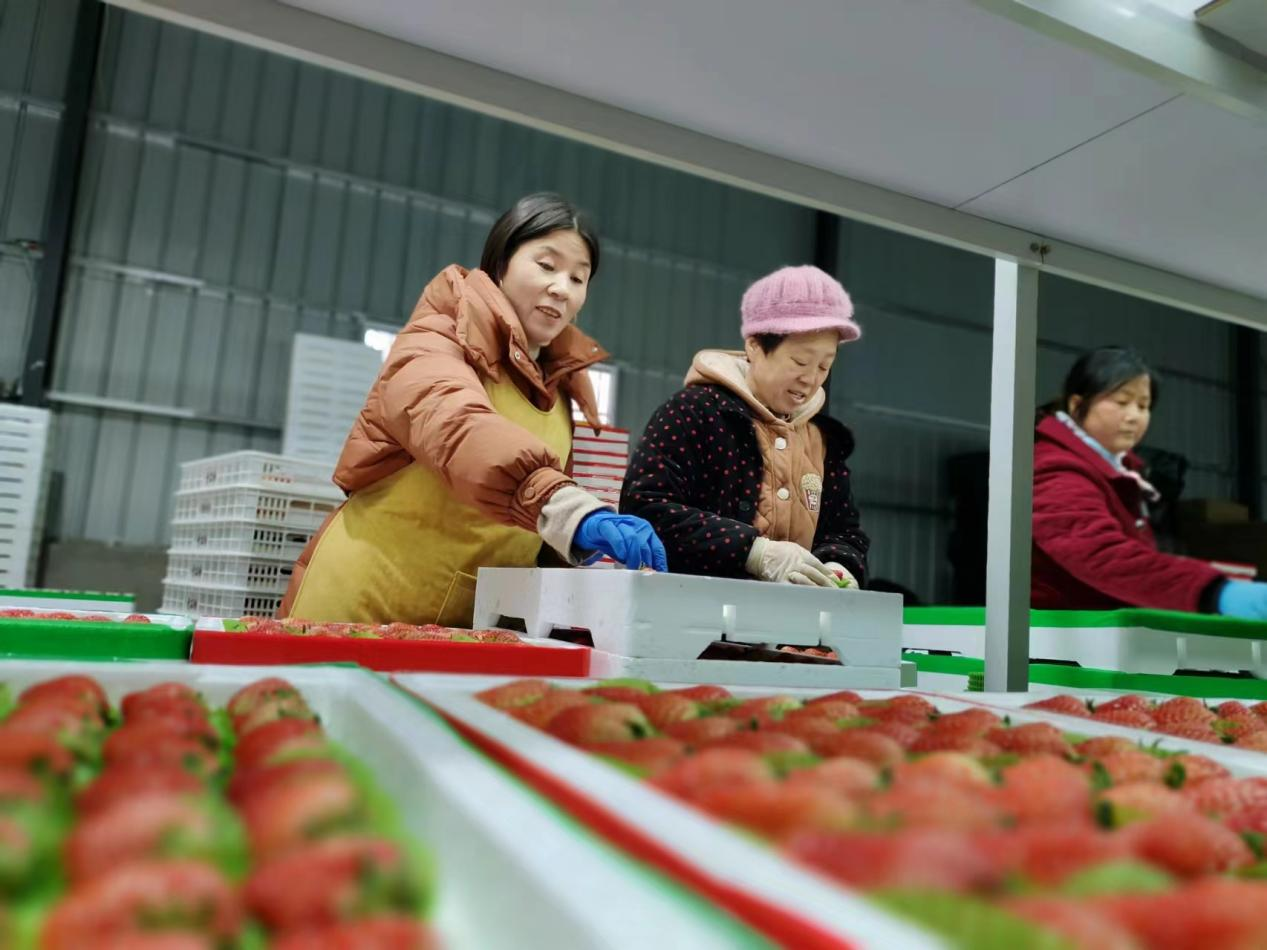 (在集中收购点的车间内,种植户正在分拣打包草莓。姚森摄)
