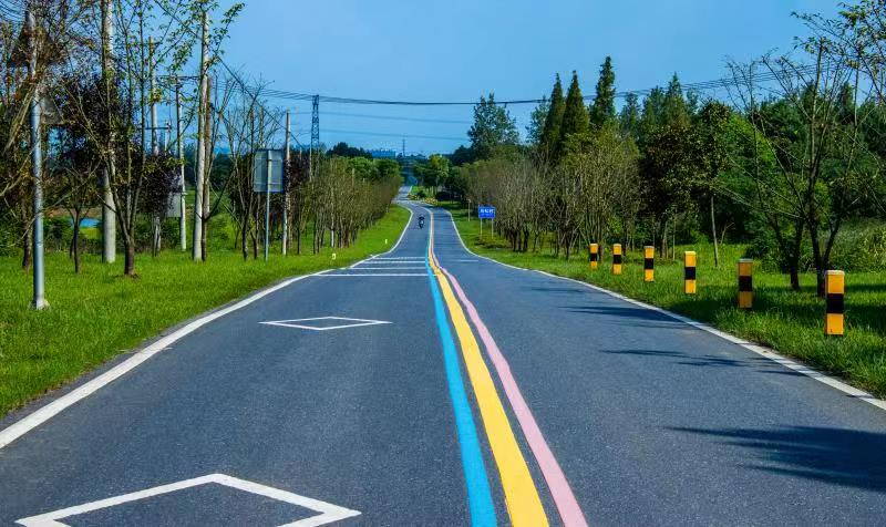 “彩虹路”沿路行道线以红、黄、蓝三色喷涂。极目远眺,红、黄、蓝三条线有如彩虹,将沿线乡村美景串珠成链,踏上“彩虹”,仿佛置身于一幅延展向天际的山水画卷。