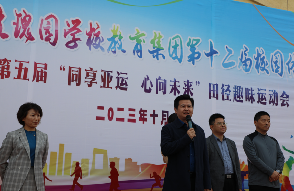 10月24日,在第19届亚运会圆满闭幕之际,合肥一六八玫瑰园学校东校区第五届“同享亚运 心向未来”运动会开幕式在学校操场举行。校园里彩旗飘飘,全校师生欢聚一堂,为运动会的盛大开幕增光添彩。合肥经开区社发局督学宋美华、张煊,东校区执行校长陈炳炎、副校长张莉莉、副校长汪文龙、校长助理吴燕青、校长助理姚启规、上海市三泉路小学校长王晓燕,以及部分家长代表出席运动会开幕式。